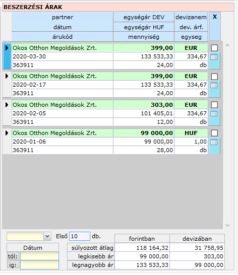 A beszerzési árak panel alján található 'Első __ db.' feliratú beviteli mezővel az első 'n' számosságú beszerzési árat jeleníthetjük meg. Az 'első' azt jelenti, hogy időrendben visszafelé sorrendezve az első N darab, azaz a legutóbbi N darab beszerzés.